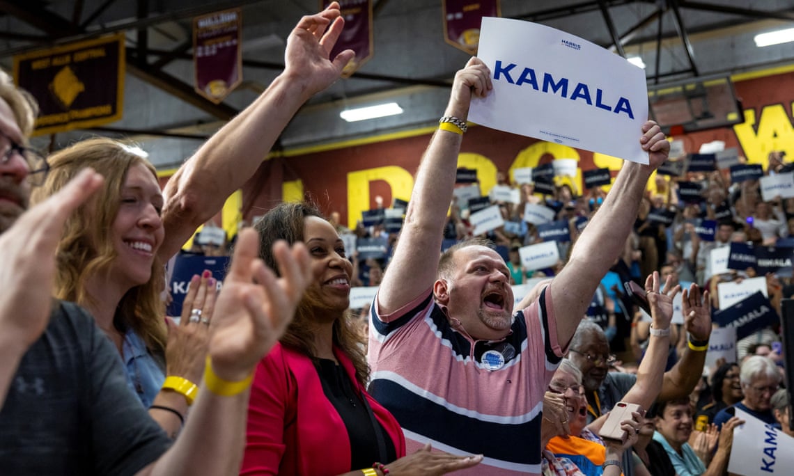 | Supporters of Kamala Harris cheer at a campaign event at West Allis high school in West Allis,Wisconsin,on23July2024. Photograph: Kevin Mohatt/Reuters |